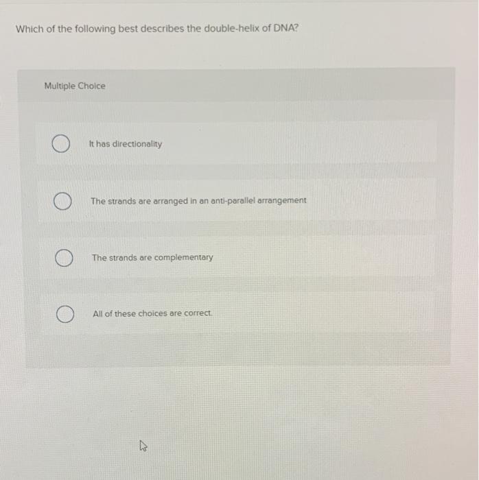 O Note that all the answer options are written to begin with 5. O We can write the DNA either way as long as we clearly note the direction. A beta-pleated sheet B double parallel helical strands C turn-loop-turn D double antiparallel helical strands.